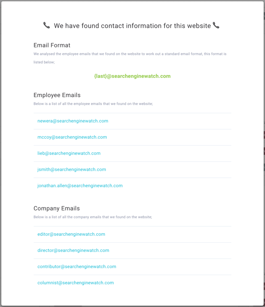 1. Email Format – this is the format that we believe the website uses for their email address, this can be great if we did not find the specific persons email address you were looking for.
